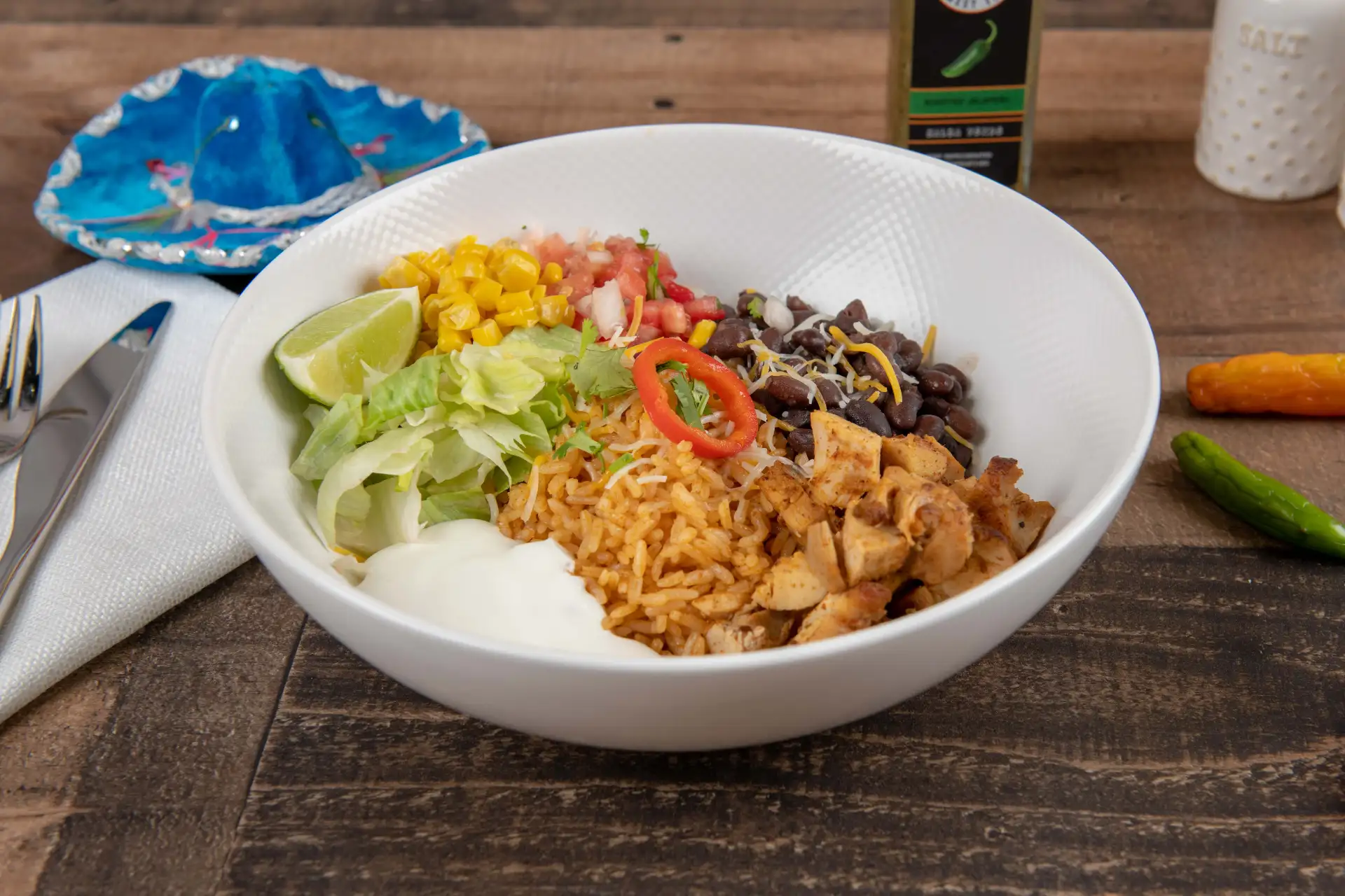Healthy and delicious bowl, Rice, Black Beans, Lettuce, Pico de Gallo, Chipotle sour cream, Corn, Cheese, and Choice of Protein. Include Chips and Salsa